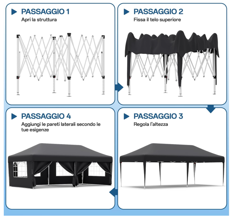 Fabriquée en tissu oxford haute densité, notre tonnelle pliante 3×6 offre une excellente résistance à l’eau et à l’usure. La surface est dotée d’un revêtement argenté, garantissant une protection efficace contre les rayons UV. Profitez de moments agréables à l’ombre rafraîchissante de votre abri.
